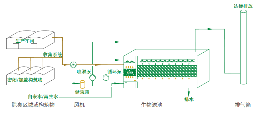 生物技術(shù)主要是在適用的溫度、濕度、pH等條件下,培養(yǎng)能分解惡臭氣體成分的微生物,通過微生物的生理代謝將目標(biāo)污染物加以轉(zhuǎn)化,使目標(biāo)污染物被有效分解去除,從而達(dá)到降解惡臭物質(zhì)的目的。主要包括:生物濾池、生物滴濾和土壤濾池。